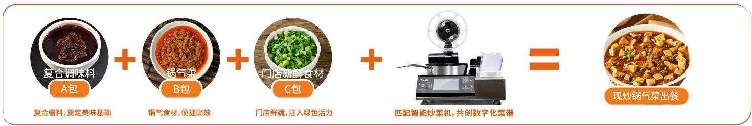 新雅軒針對(duì)炒菜機(jī)器人特性定制研發(fā)「標(biāo)準(zhǔn)化專用醬料」,整體顆粒均勻、高溫耐受、風(fēng)味穩(wěn)定,解決「普通醬料」結(jié)塊或粘稠導(dǎo)致投料系統(tǒng)堵塞、高溫導(dǎo)致焦糊或風(fēng)味揮發(fā)等難題,標(biāo)準(zhǔn)化工藝打造,無(wú)需復(fù)雜調(diào)味,搭配新雅軒“A+B+C”標(biāo)準(zhǔn)化出餐模式,一醬即成菜,保障菜品風(fēng)味精準(zhǔn)復(fù)刻,千店如一!